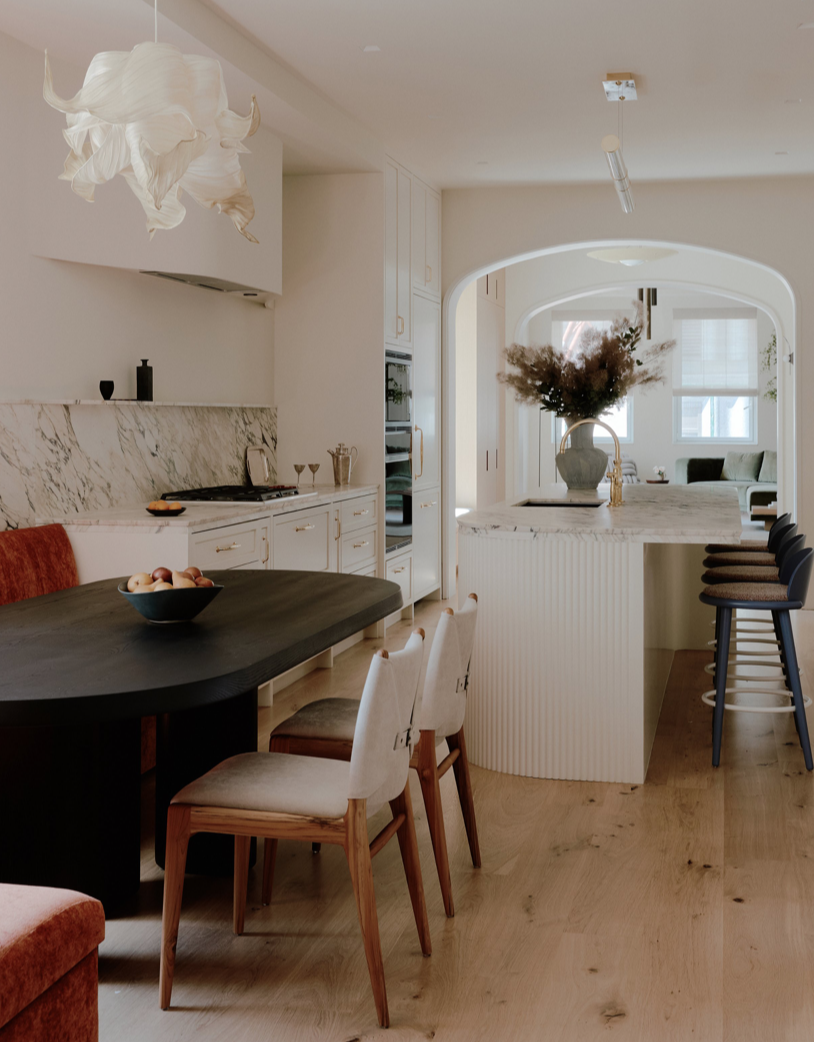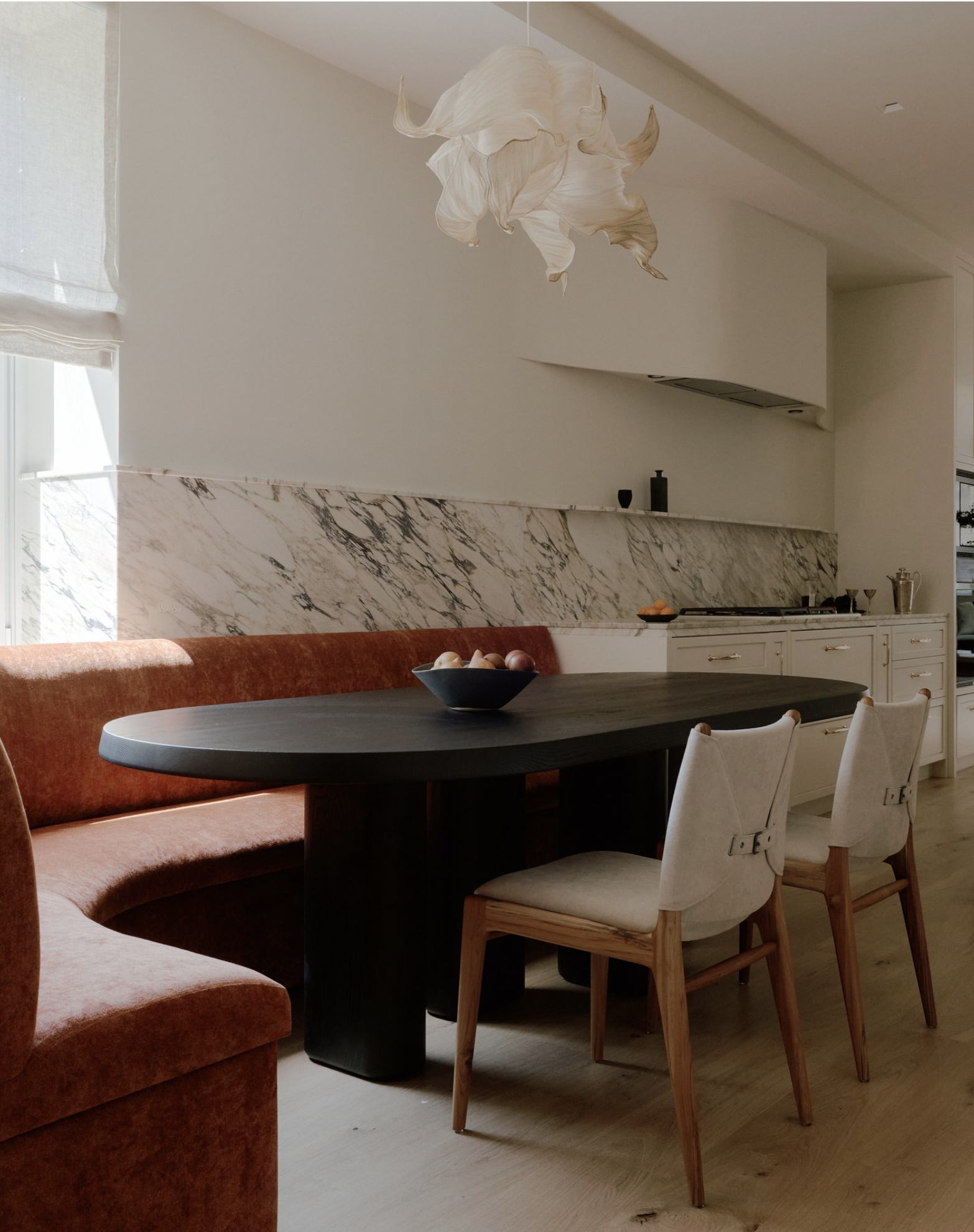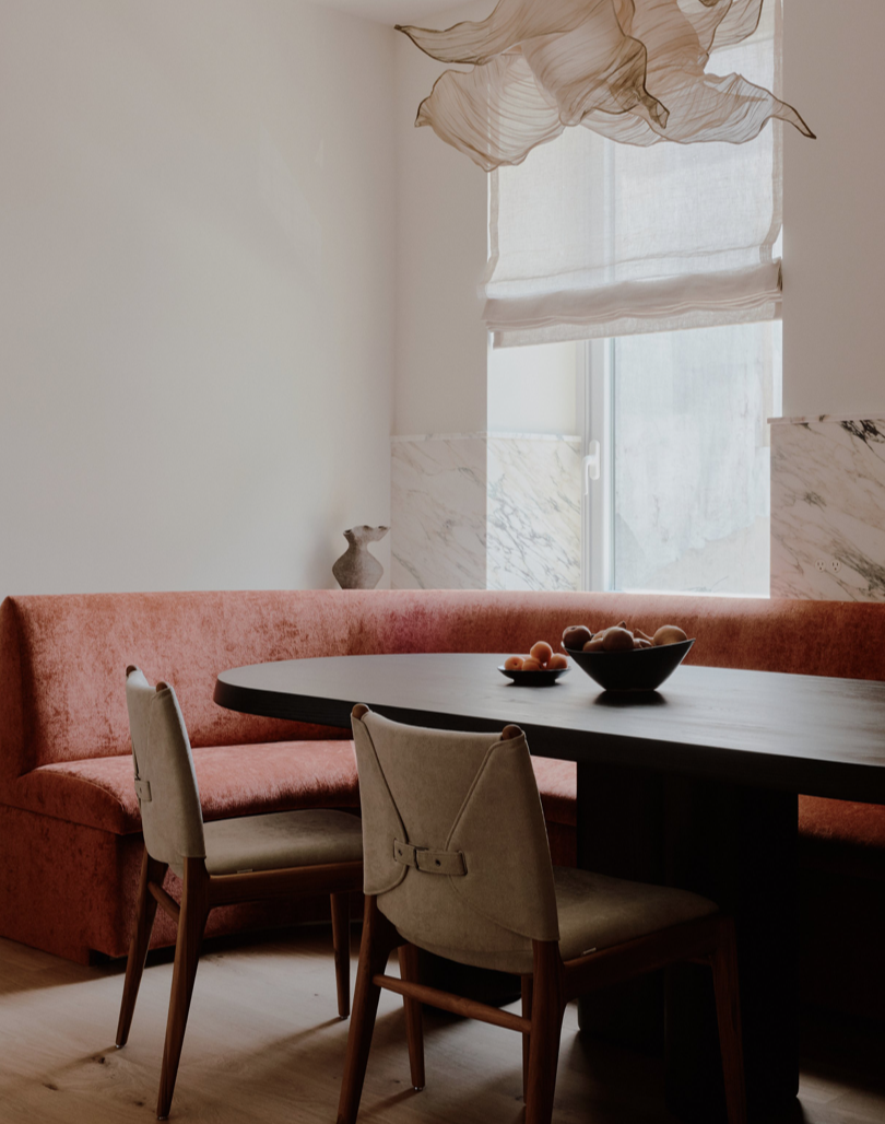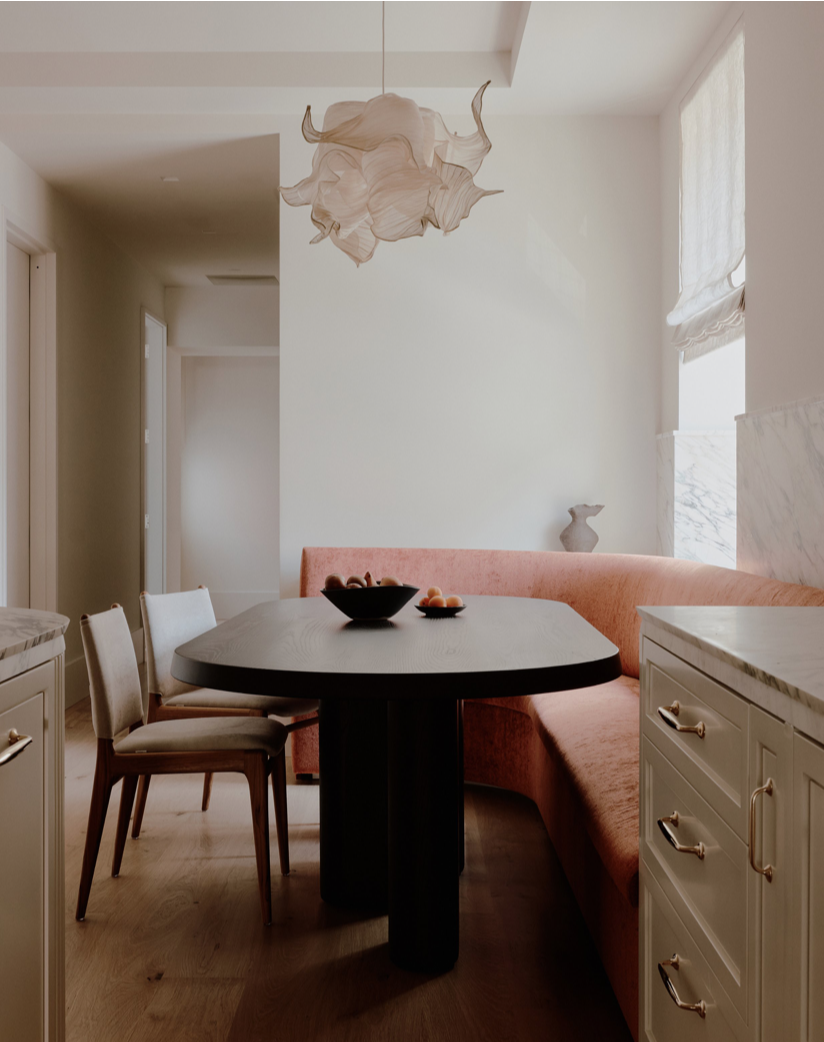 As the kitchen serves as the focal point of the home, we ensured the banquette seating was suitable for young children and daily use. We opted for a calm and neutral color palette with accent colors introduced through fabric selection.
